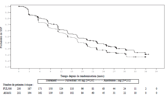 Lorsque les fréquences sont différentes entre l’analyse de tolérance poolée et FALCON, la fréquence la plus élevée est présentée. Les fréquences dans le tableau 1 ont été établies à partir de tous les effets indésirables rapportés, indépendamment de l’évaluation de la causalité par l’investigateur. La durée médiane du traitement par fulvestrant 500 mg sur l’ensemble des données (y compris les études mentionnées ci-dessus et FALCON) était de 6,5 mois.