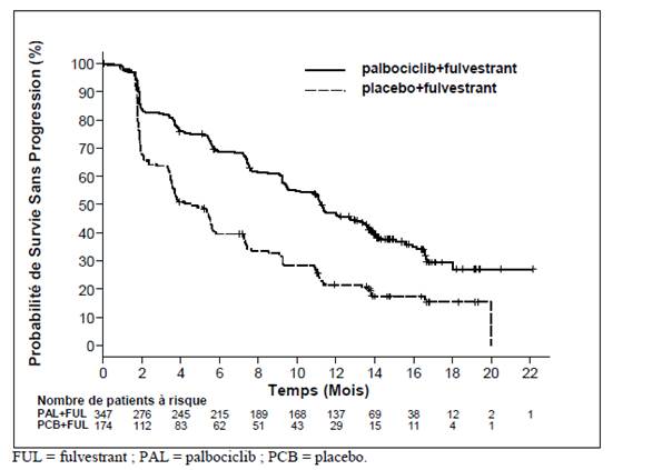 Les symptômes rapportés par les patientes ont été évalués à l’aide du questionnaire sur la qualité de vie de l’European Organization for Research and Treatment of Cancer (EORTC) (QLQ)-C30 et de son module spécifique sur le cancer du sein (EORTC QLQ-BR23). Au total, 335 patientes du bras fulvestrant plus palbociclib et 166 patientes du bras fulvestrant plus placebo ont rempli le questionnaire à l’inclusion et au cours d’au moins une visite après la visite à l’inclusion dans l’étude.