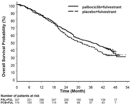 Le délai avant détérioration était prédéfini comme étant le délai entre l’inclusion et la première survenue d’une augmentation ≥ 10 points des scores en termes de symptômes douloureux. L’ajout du palbociclib au fulvestrant a apporté un bénéfice sur les symptômes en allongeant significativement le délai avant détérioration de la douleur en comparaison avec l’association de fulvestrant plus placebo (médiane de 8,0 mois versus 2,8 mois ; HR de 0,64 [IC à 95 % : 0,49 - 0,85] ; p < 0,001).