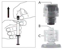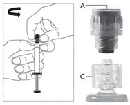 · Retirez le corps de la seringue en verre du plateau-support et vérifiez qu’il n’a pas été endommagé. · Retirez l’emballage extérieur de l’aiguille protégée. · Les solutions à usage parentéral doivent être contrôlées visuellement avant administration afin de détecter la présence de particules ou un changement de coloration. · Tenez la seringue à la verticale sur la partie nervurée (C). Avec l'autre main, saisissez le capuchon (A) et tournez soigneusement dans le sens contraire des aiguilles d’une montre jusqu'à la déconnexion du capuchon qui peut alors être retiré (voir figure 1).