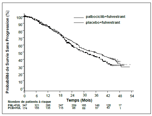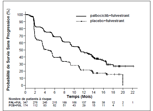Les symptômes rapportés par les patientes ont été évalués à l’aide du questionnaire sur la qualité de vie de l’European Organization for Research and Treatment of Cancer (EORTC) (QLQ)-C30 et de son module spécifique sur le cancer du sein (EORTC QLQ-BR23). Au total, 335 patientes du bras fulvestrant plus palbociclib et 166 patientes du bras fulvestrant plus placebo ont rempli le questionnaire à l’inclusion et au cours d’au moins une visite après l’inclusion dans l’étude.