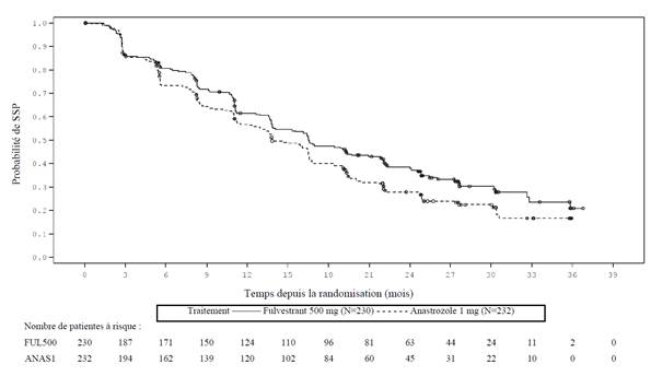 Lorsque les fréquences sont différentes entre l’analyse de tolérance poolée et FALCON, la fréquence la plus élevée est présentée. Les fréquences dans le tableau 1 ont été établies à partir de tous les effets indésirables rapportés, indépendamment de l’évaluation de la causalité par l’investigateur. La durée médiane du traitement par fulvestrant 500 mg sur l’ensemble des données (y compris les études mentionnées ci-dessus et FALCON) était de 6,5 mois.