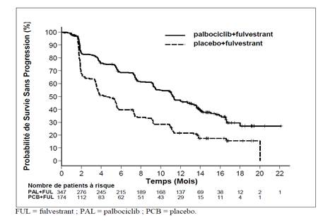 Les symptômes rapportés par les patientes ont été évalués à l’aide du questionnaire sur la qualité de vie de l’European Organization for Research and Treatment of Cancer (EORTC) (QLQ)-C30 et de son module spécifique sur le cancer du sein (EORTC QLQ-BR23). Au total, 335 patientes du bras fulvestrant plus palbociclib et 166 patientes du bras fulvestrant plus placebo ont rempli le questionnaire à l’inclusion et au cours d’au moins une visite après la visite à l’inclusion dans l’étude.