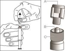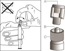 · Tenez la seringue à la verticale sur la partie nervurée (C). Avec l’autre main, saisir le capuchon (A) et basculer soigneusement d’avant en arrière jusqu’à la déconnexion du capuchon qui peut alors être retiré, ne pas tordre (voir Figure 1).